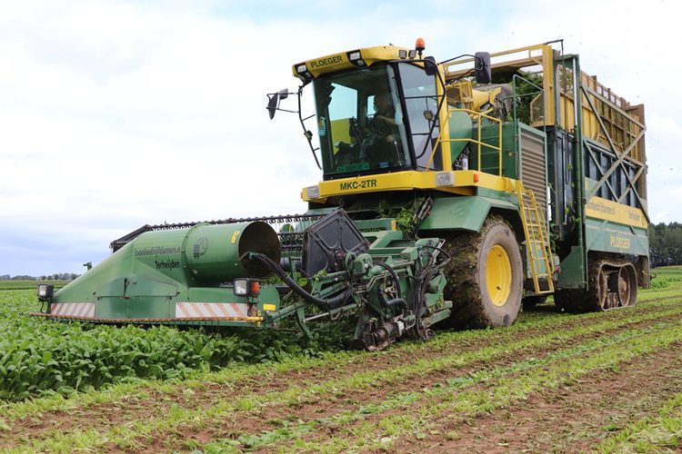 Loonbedrijf Damen is gevestigd in het Brabantse Terheijden. Het perceel met biologische spinazie, waar chauffeur Jochem Cloots bezig is deze ochtend, ligt vijftig kilometer verderop. “Vandaar dat wij op deze Ploeger MKC-2TR oogstmachine, op tracks, een wielstel hebben gemaakt. Het wielstel tilt de rupsen van de grond, zodat wij met veel minder rolweerstand kunnen rijden. Met een gangetje van zo’n 28 kilometer per uur ben ik ruim 2,5 uur onderweg. Doordat ik met het wielstel rijd, slijten de rupsen minder hard.” De oogstmachine staat, tijdens het oogsten zelf, op twee rupsen van negentig centimeter breed om de bodemdruk zo laag mogelijk te houden. Verder hebben de rubberen rupsen een lage nok om het gewas zo min mogelijk te beschadigen.