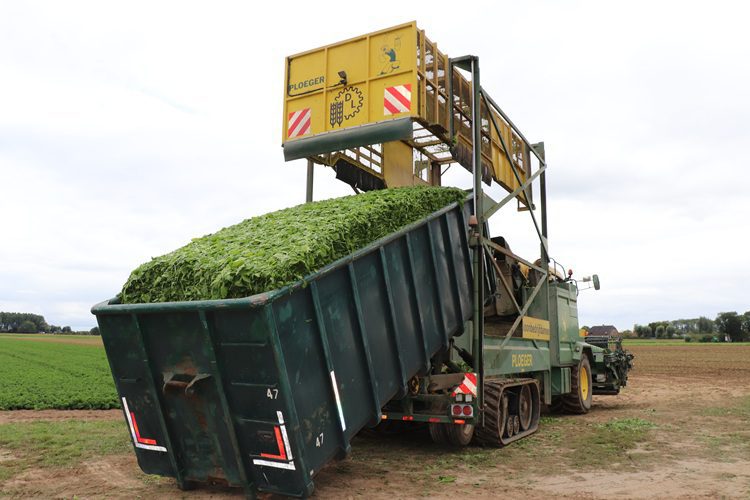 Gemiddeld doet de chauffeur er deze dag drie kwartier over om de container met spinazie te vullen. Afhankelijk van hoe droog het gewas is, kan hij tien tot dertien ton per container ermee vullen. Nadat de container vol is, wordt de spinazie lichtelijk aangedrukt, zodat zoveel mogelijk product netjes in de container blijft. Bij aankomst op de kopakker wordt de container in zo’n twee minuten op de grond klaargezet voor de vrachtwagenchauffeur. Hij pikt de container met een haakarmsysteem eenvoudig op.