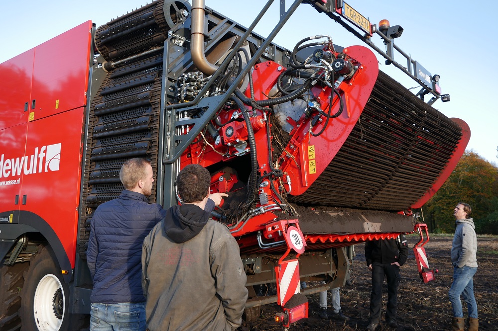 De rooi demonstratie met de Dewulf Enduro van vrijdag 5 november jongstleden bracht veel nieuwsgierige aardappeltelers en dealers op de been. Vanuit heel Noord Nederland en Flevoland trokken zij naar het Orvelter veld om de troeven van deze machine van dichtbij te bekijken. Organisator Gerry Wasse weet wel waarom. “Er is best vraag naar een 4-rijer op wielen als alternatief voor een machine op rupsen, zeker als je grotere afstanden tussen percelen moet overbruggen. De Enduro is daarbij ook een interessant alternatief voor een 2-rijer qua prijs in relatie tot capaciteitswinst”.