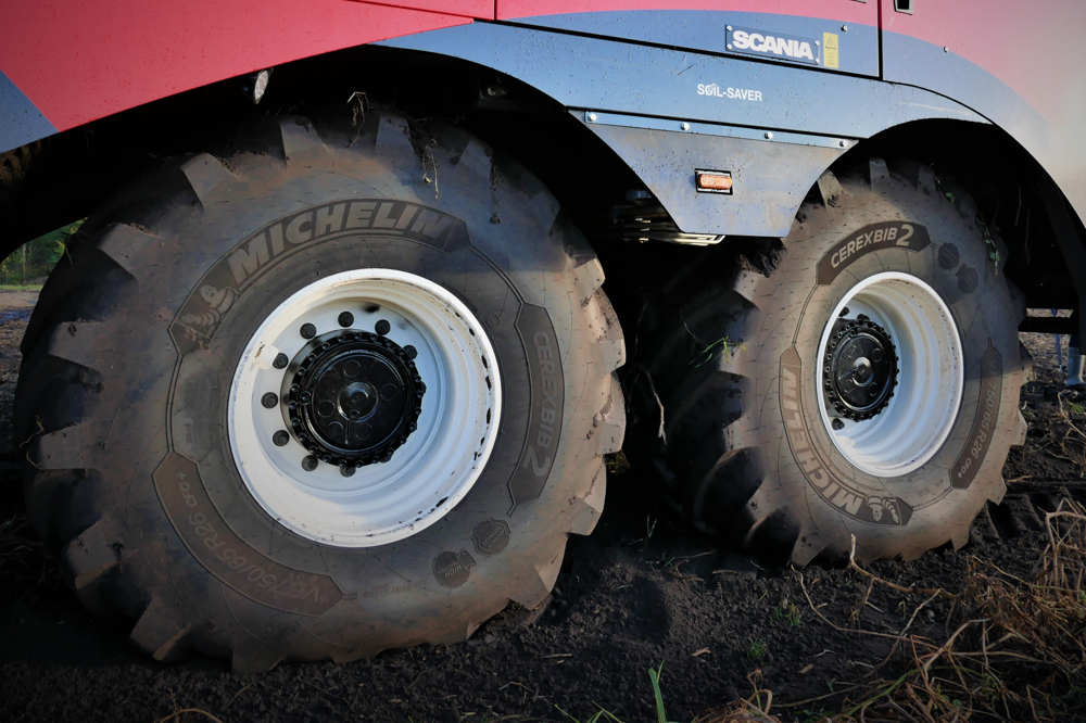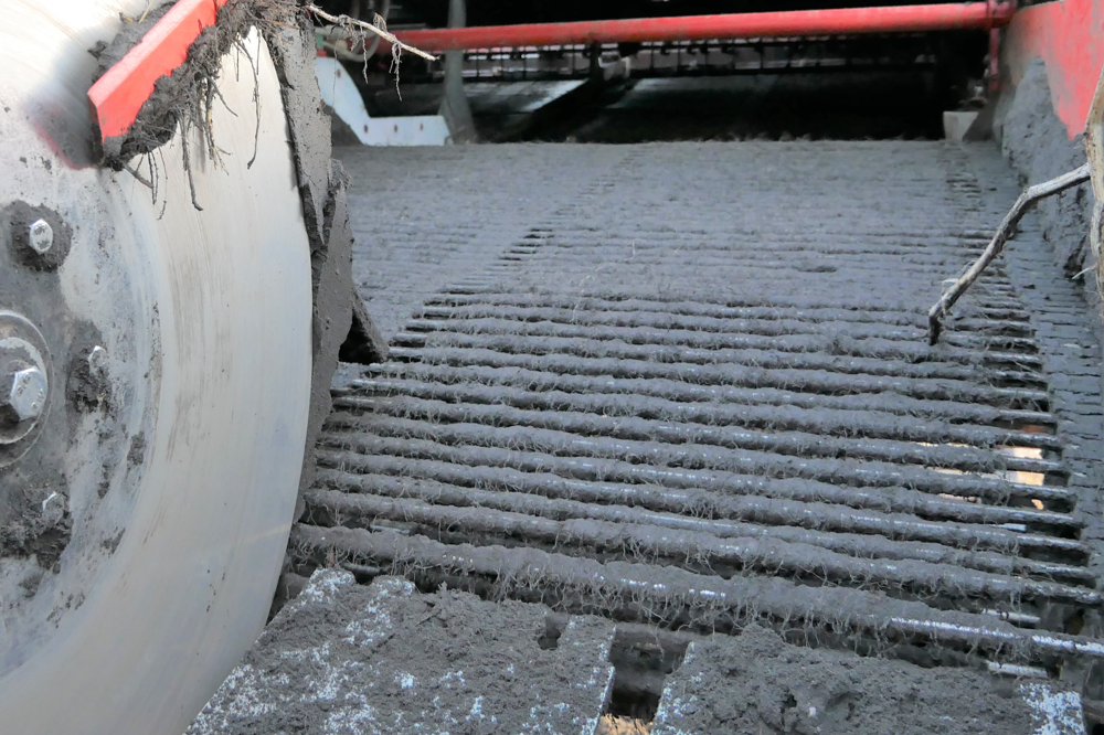 Wouter Truin, productspecialist bij Wasse B.V. legt uit. “Dan heb je het over productvriendelijkheid, capaciteit en gebruiksgemak. De clou zit hem in de constructie van de twee bestuurbare achterassen. De vier VF banden van 75 centimeter breed op een velg van 26 inch maken het mogelijk om vier zeefmatten mooi geleidelijk oplopend boven de banden te monteren. Overal 3 meter breed, zonder vernauwingen. Dat geeft een enorme zeefcapaciteit, met minder kans op verstoppingen. De achterbanden hebben zoveel draagkracht dat ze 85 procent van het gewicht dragen maar toch nog een zeer lage bodemdruk afgeven (een bodemdruk van 1,5 kg/cm2 volgens opgave fabrikant, red)”.