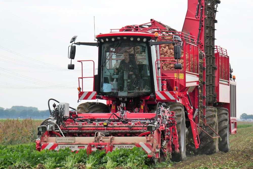 Loonbedrijf Breure-De Waard gaat in Flevoland ruim tweeduizend hectare suikerbieten te lijf met zeven bietenrooiers. Afgelopen maand is de vierde Holmer in bedrijf genomen. Voor chauffeur Marco van Dijke is deze drieassige Holmer T4 40 van vijftien meter lang met een dertig tons bunker, knikbesturing en hondengang ook een primeur. Op de zware klei van Jos Heeman in Biddinghuizen kan hij met de machine meteen vol aan de bak om acht hectare ‘vroege levering’ voor de regen uit de grond te scharen.