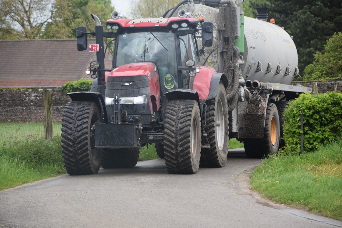 We treffen Maxime Van Moorleghem in Noord-Frankrijk aan het stuur van zijn Case-Joskin-combinatie tijdens het uitrijden van mest. De aanvoer van mest gebeurt met twee andere combinaties van Case-trekkers met Joskin-tonnen. Eén van deze trekkers is uitgerust met de Michelin Roadbib-banden. De chauffeur vertelt dat deze band duidelijk minder slijtage vertoont. “Maar wat we misschien niet helemaal verwacht hadden, is dat hij het ook op het veld erg goed doet. Niet zo goed als een landbouwband, maar het gaat echt wel goed.” De andere trekkers die met de Roadbib-banden zijn uitgerust rijden enkele tientallen kilometers verder rond met grondkippers.