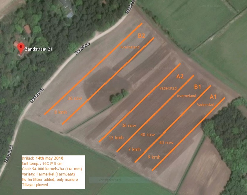 Voor het onderzoek in de snijmaïsteelt zijn er 2 vergelijkwaardige machines gekozen, te weten een Kverneland Optima HD en de Vaderstad TPV. Beide in vergelijkbare uitvoering en leeftijd. Verder zijn zaadsoort, zaadafgifte en zaadlotnummer bij deze proef identiek. Beide machines hebben 2 stroken met een lage snelheid en 2 stroken met een hogere snelheid ingezaaid. De stroken waren in herhaling aangelegd om veldeffect te herkennen.