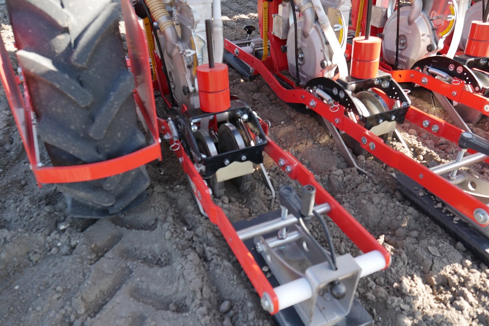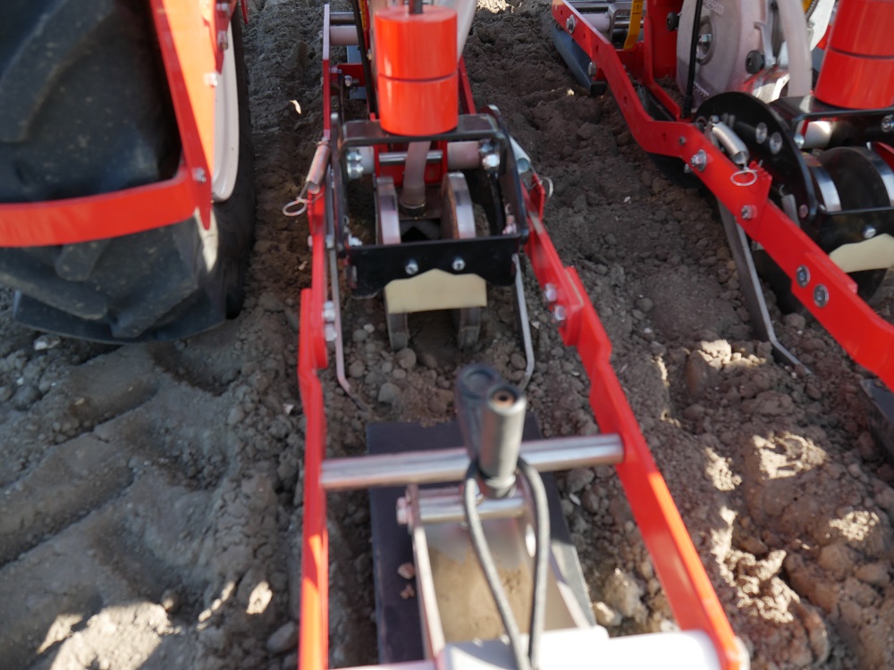 Waar de al benoemde ski’s zorgen voor stabiliteit van het zaai-element – en daarmee voor een constante zaaidiepte – daar zorgen pengewichten voor een constante druk op de aandrukwielen. De aandrukwielen zijn onafhankelijk in het zaai-element opgehangen zodat overal het uienzaad met hetzelfde gewicht aangedrukt wordt wat een goede vochtopname een snelle ontkieming stimuleert.