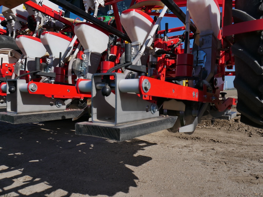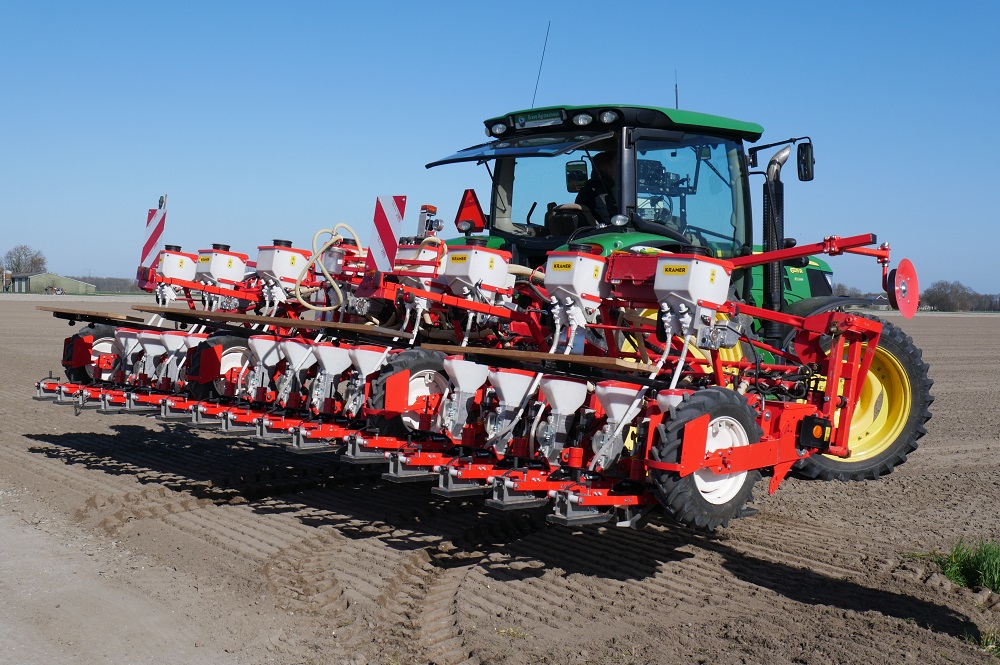 Loonbedrijf Vedelaar uit Nagele heeft een Kramer Proseeder voor het zaaien van uien op 2,25 meter met een werkbreedte voor drie bedden. Opvallend zijn de ‘ski sloffen’ aan de voor- en achterzijde van het zaai-element. Die vlakken de grond voor het kouter af en na het zaaien drukken die de zaai-voor licht aan. De ski’s zorgen voor een stabiele loop van het zaai-element en dat is een belangrijke factor voor een constante zaaikwaliteit.
