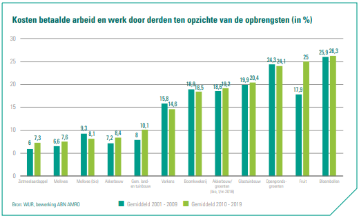 Een belangrijk gevolg hiervan is dat de kosten van arbeid toenemen. In de periode van 2010 tot en met 2019 bedroegen de kosten van betaalde arbeid in de Nederlandse land- en tuinbouw gemiddeld 10 procent van de omzet tegen zo’n 8 procent in het vorige decennium. De kosten zijn onder meer toegenomen in de gangbare melkveehouderij, de glastuinbouw en de akkerbouw, zoals is te zien in de onderstaande tabel. Deels zijn de oorzaken specifiek voor de branche. Zo wordt in de tomatenteelt vaker gewerkt met rassen die kleine vruchten hebben en daardoor meer arbeid vereisen.