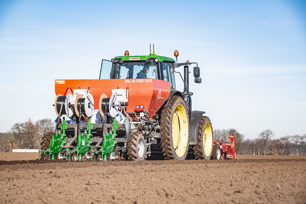 Druppelirrigatie is volgens Franje relatief gezien een dure oplossing, maar het is een voordeel dat de loonwerker zelf de machine heeft opgebouwd om de proef uit te voeren. Voor de John Deere 6120M van Loonbedrijf Damen is een Tulip Roterra 252-25 rotorkopeg voor de eerste bewerking geplaatst. Voor het planten wordt gebruik gemaakt van een Delta Planter Drill Six Stereo. “Het gaat om minder maar wel bredere rijen om de ui optimaal te laten groeien. Over de volledige werkbreedte liggen zes rijtjes, met tussen iedere rij een dripslang.”