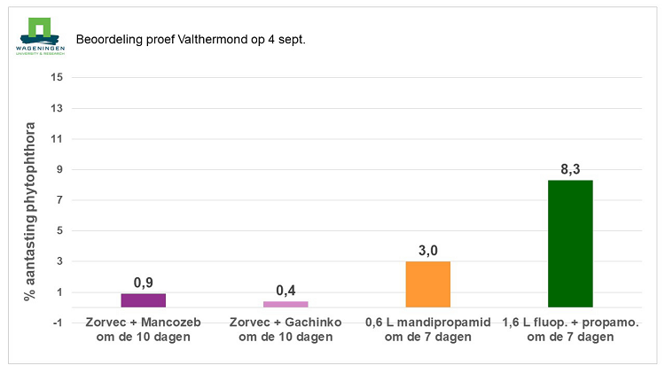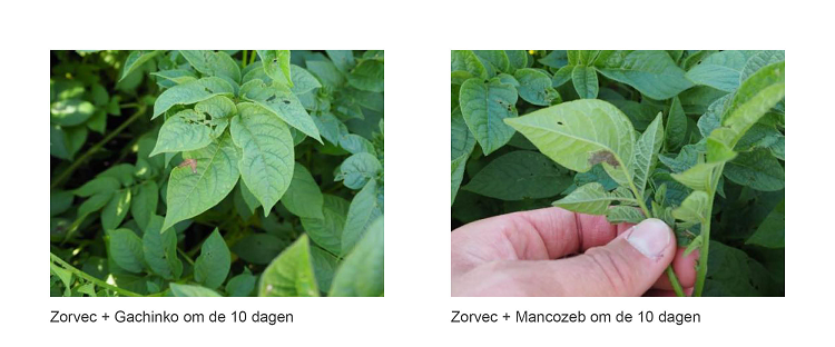 In 2019 is door Wageningen UR een onderzoek gedaan naar de effectiviteit van verschillende middelen tegen Phytophthora. Dit proefveld lag op de locatie Valthermond (Dr.). Hieruit bleek dat Zorvec zelfs met een langer spuitinterval een betere bescherming tegen Phytophthora gaf.