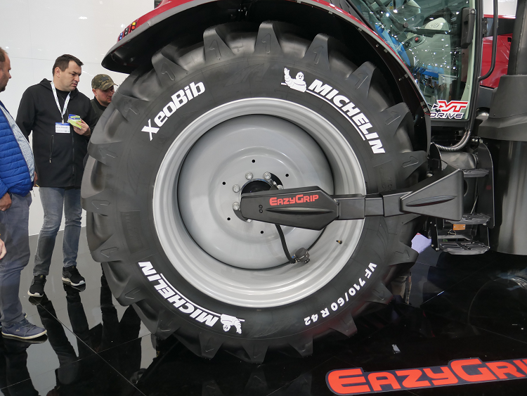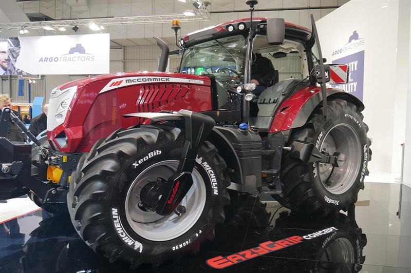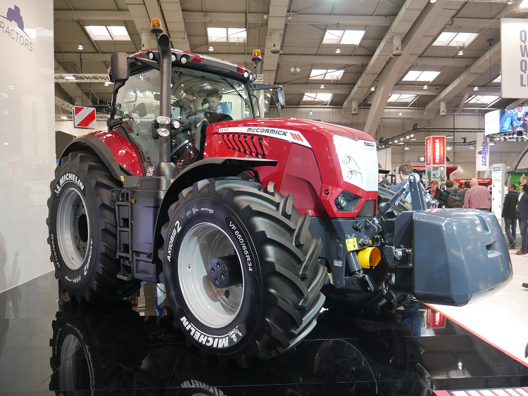 Het topmodel van McCormick X8.631 VT van 310 pk. Alles is een maatje groter, zo ook de branstoftank die 200 liter meer inhoud heeft. Een plaatje op de beursvloer zoals hij erbij staat op de Axiobib 2 van Michelin.