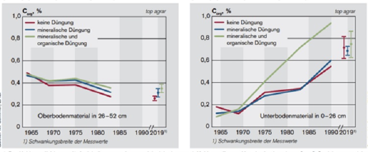 In de onderstaande grafieken zijn de effecten van de segmentploeg nagebootst door de effecten van CO2- vastlegging te monitoren in grond uit de bovenlaag van de bouwvoor op een diepte van 26 tot 52 centimeter en de vastlegging in puur grond uit de onderlaag in het 0 tot 26 centimeter traject. De effecten zijn gemeten bij drie bemestingsniveaus: kunstmest, kunstmest plus organische mest en geen bemesting. Duidelijk is de CO2- opname waarneembaar in de bovenste bouwvoor van grond afkomstig uit de beneden bouwvoor. En de afname van CO2 in de diepere laag van de grond uit de bovenlaag. Let wel, dit is een proef van meerdere decennia.