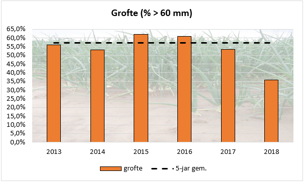 Ook wat betreft de grofte kunnen we concluderen, dat het percentage 60 mm opwaarts fors lager ligt dan het langjarig gemiddelde. Dit percentage bedraagt 35,7%, terwijl het 5-jarig gemiddelde op 57,1% ligt. In 2017 lag dit percentage op 53,4%. Een en ander is weergegeven in de grafiek hiernaast.
