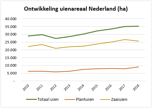 Wederom is het totale areaal uien in Nederland in 2018 uitgebreid, zoals te zien is in bijgevoegde grafiek. De uitbreiding van het areaal is gebaseerd op cijfers vanuit het CBS. De areaaluitbreiding komt met name door de uitbreiding van het areaal plantuien. Het areaal zaaiuien is dit jaar afgenomen.