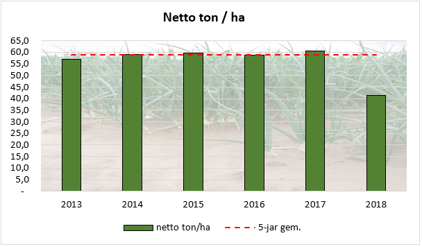 De gemiddelde opbrengst van alle ingestuurde resultaten is 41,4 ton/ha. Dit is een gewogen gemiddelde. In 2017 was dit 60,5 ton/ha. De verschillen tussen percelen zijn groot. Het minimum is 6,8 ton/ha, terwijl het maximum 83,9 ton/ha bedraagt. Het productieniveau per hectare ligt daarmee ver onder het niveau van het 5-jarig gemiddelde. Een en ander is weergegeven in de grafiek hiernaast.
