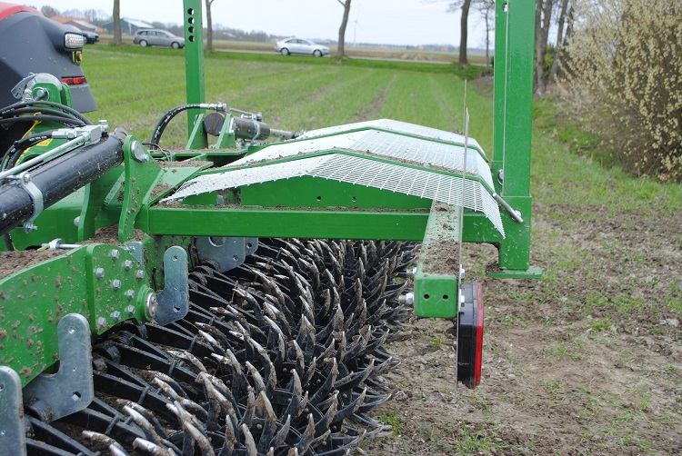 Met een snelheid van 25 kilometer per uur (afhankelijk van de werkdiepte) wordt een prima resultaat geboekt. “Hierdoor is het ook een capaciteitsmachine.” Akkerbouwer Hotting heeft een variant met een werkbreedte van zes meter. Volgens Van der Veen zijn de wiedeggen leverbaar in werkbreedtes van minimaal drie en maximaal twaalf meter. De diepte van de bewerking, maximaal vier tot vijf centimeter, kan met de loopwielen worden bepaald. “De wiedeg is modulair opgebouwd en uitgevoerd met de standaard opties, zoals het hydraulisch opklappen. Een belangrijk element is ook het ‘stenenscherm’. Met een snelheid van twintig kilometer per uur is zo’n spatscherm voor het beschermen van de trekker geen overbodige luxe.” Sinds de aankondiging van de overname door Pöttinger is er al veel interesse getoond. “Vanaf augustus zijn de machines pas leverbaar.”