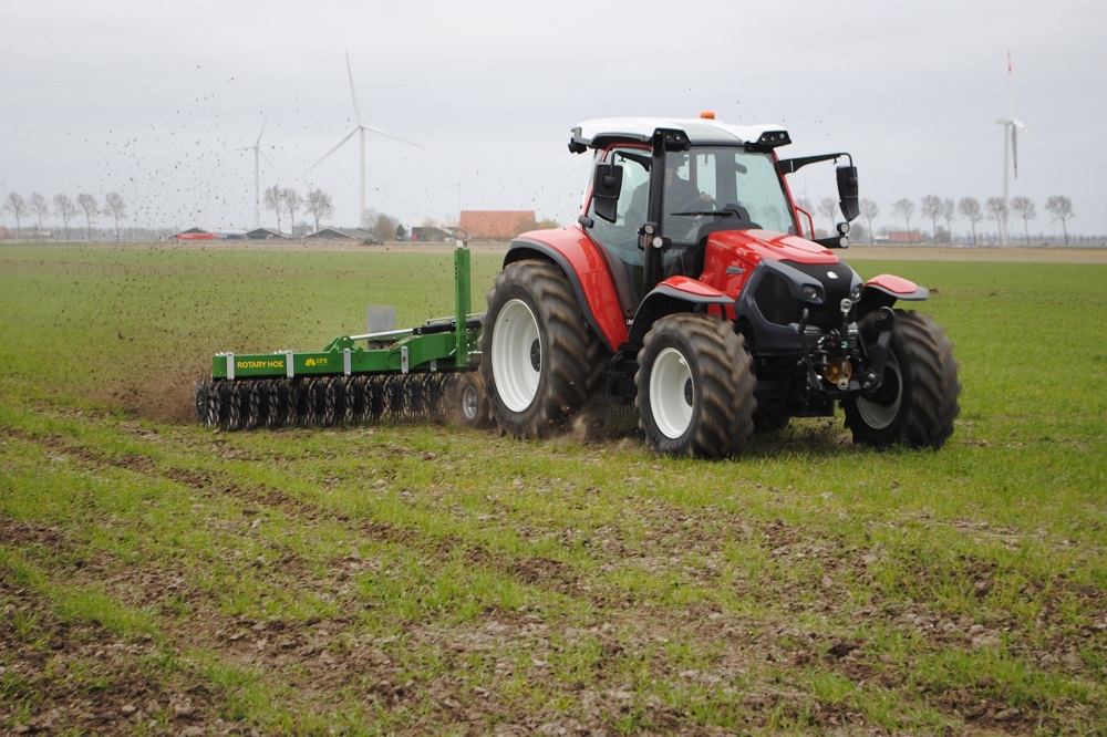 Het werken met de Rotary Hoe van CFS/Pöttinger bevalt Hotting goed. In een uur tijd is het mogelijk om tien hectare te bewerken. “Het is een lichte bewerking, waardoor het onkruid er uit gaat, maar het jonge tarwe plantje blijft staan. Eigenlijk wordt er een vals zaaibed bij het tarwebed gemaakt”, vertelt Kees Hotting.