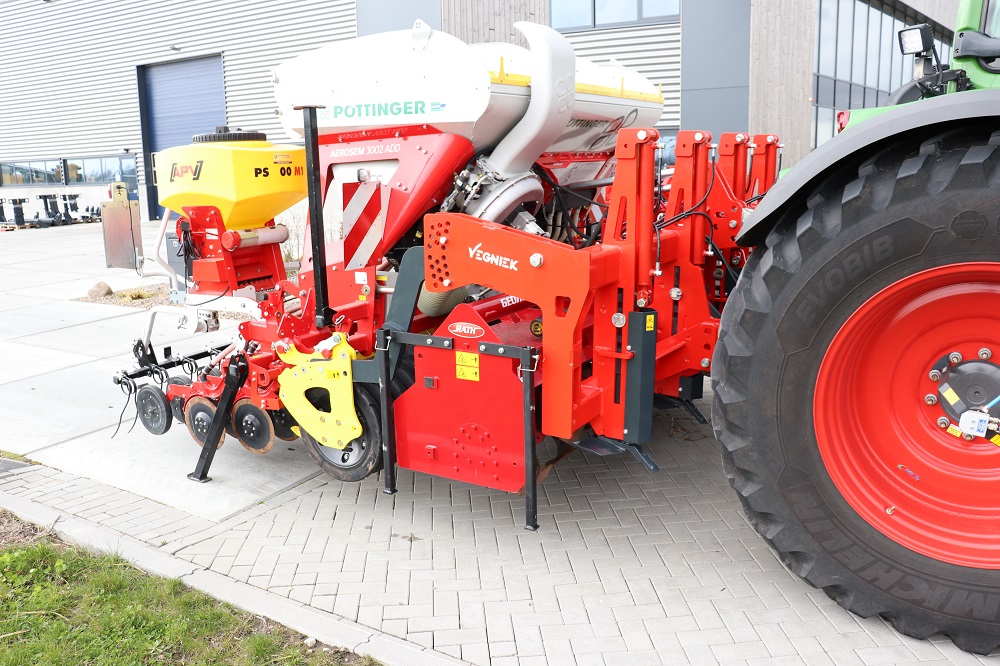 Zandvliet komt veel verdichte percelen tegen en daarom is het beluchten van de ondergrond en het doorbreken van storende lagen onder de zaai-rij voor hem een must. Dat vergt een compacte voorzetwoeler zodat de zaaicombinatie kort aangebouwd kan worden en hefbaar blijft. Vegniek bleek gespecialiseerd te zijn in deze constructies en construeerde deze compacte voorzetwoeler met hydraulisch verstelbare woelpoten; wat de combinatie flexibel inzetbaar maakt.