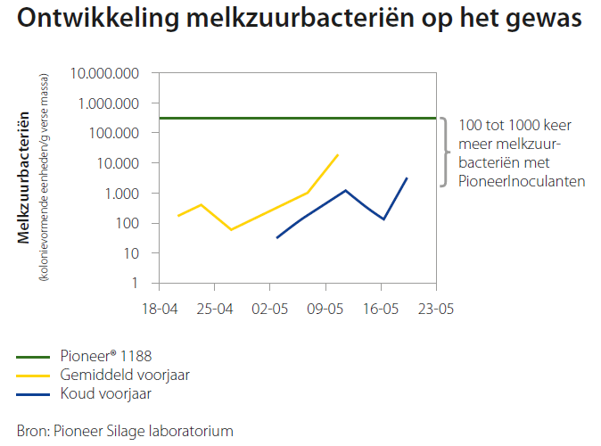 Vooral bij een natte snede – minder dan 35% DS – is toevoeging van een enkelvoudig werkende inoculant noodzakelijk. Met enkelvoudig wordt hier bedoeld een inoculant die alleen werkt op de conservering zoals PIONEER® 1188. De 6 bacteriestammen van Pioneer® 1188 zorgen in natte omstandigheden voor een snelle pHdaling. Door een snelle daling van de pH wordt minder energie en eiwit afgebroken en hebben we minder NH3 in de kuil. Ook zorgt een snelle pH daling ervoor dat boterzuurbacteriën zich in de kuil nauwelijks kunnen ontwikkelen.