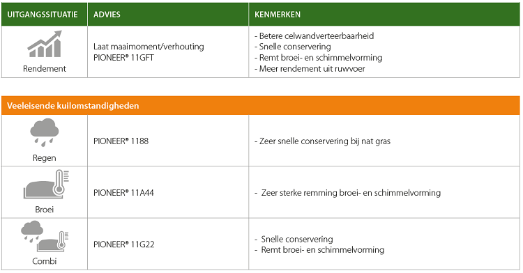 Gecombineerde middelen zoals PIONEER® 11G22 bevatten naast conserveringsbacteriën ook bacteriestammen die azijnzuur en propionzuur maken. Deze stoffen zorgen ervoor dat bij toetreding van zuurstof broei- en schimmelvorming worden onderdrukt. De ontwikkeling van gisten (broei) en schimmels zijn niet alleen afhankelijk van het uitgangsmateriaal. Broei is ook vaak bedrijfsafhankelijk. Voersnelheid, compactie van de kuil en de methode van uitkuilen zijn de factoren die het intreden van zuurstof beinvloeden. Bij hardnekkige broei is Pioneer® 11A44 ons advies.