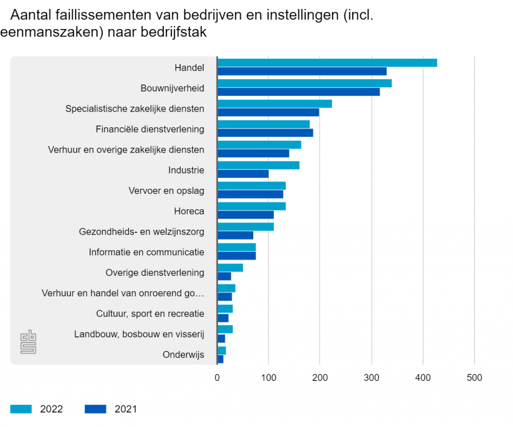 In vrijwel alle bedrijfstakken gingen er meer bedrijven failliet dan in 2021. Absoluut gezien was ook de stijging van het aantal faillissementen het sterkst in de handel. Vorig jaar gingen hier 97 bedrijven en instellingen meer failliet dan in 2021. In de detailhandel en de groothandel was de toename respectievelijk 56 en 44. De autohandel noteerde een kleine daling. Met een stijging van 59 faillissementen volgde de industrie als tweede. Binnen de industrie noteerde de voedingsmiddelenindustrie met 10 de grootste toename.
