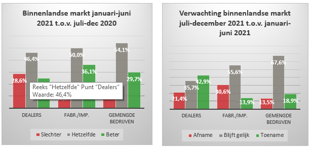 De order/verkooppositie buitenland was in het lopende half jaar (januari-juni 2021) t.o.v. het voorgaande half jaar (juli-december 2020) bij meer dan 60% van de fabrikanten/importeurs beter. De verwachting van de order/verkooppositie buitenland over het komende half jaar is voor een aanzienlijk deel van de bedrijven minder rooskleurig.