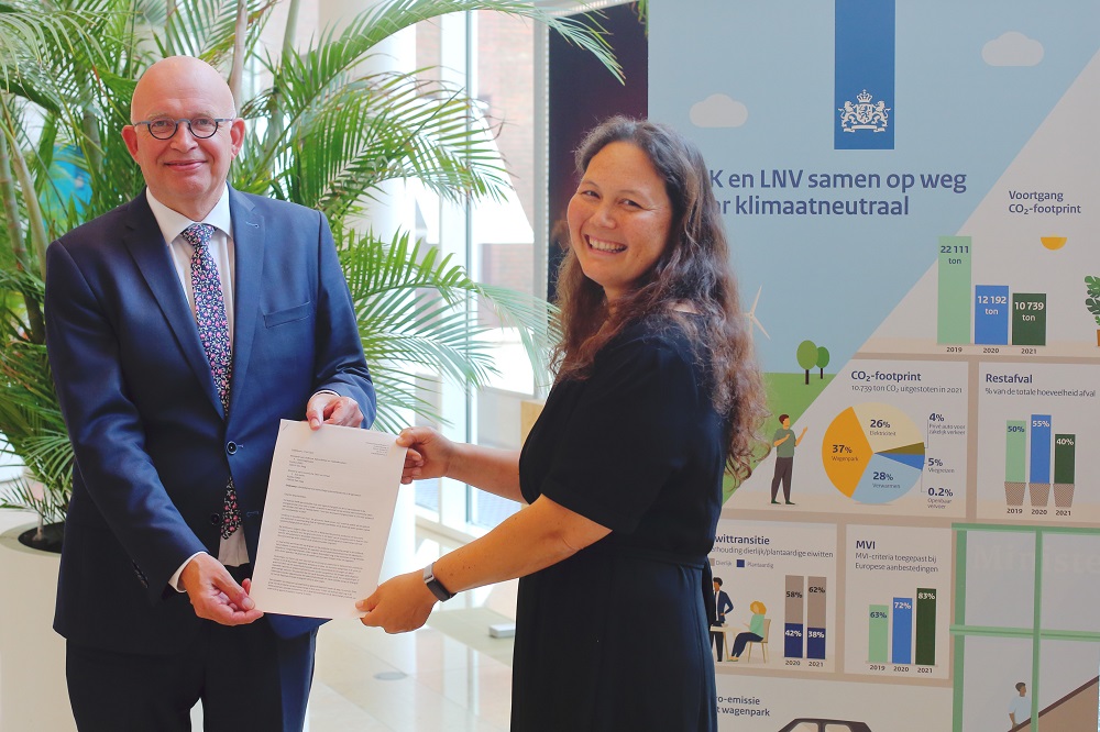 Zodoende hebben verschillende agrarische ondernemers het initiatief genomen tot een brief aan minister Staghouwer waarin ze hem vragen om subsidie-instrumenten voor kleinschalige waterstofproductie te ontwikkelen. Van Tilburg-Feiken, melkveehouder Jan Borgman en energieadviseur Rob Jacobs (L’orèl) hebben namens de ondertekenaars de brief op 13 juli in de foyer van het ministerie van Landbouw aangeboden aan minister Staghouwer.