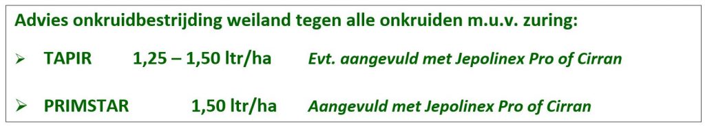 De temperaturen lopen weer wat op richting het weekend. Dan komen er ook weer geschikte momenten om de onkruiden te bestrijden. Voor een algemene onkruidbestrijding tegen bijvoorbeeld paardenbloem, muur, herderstasje, boterbloem etc. zijn de omstandigheden dan weer gunstig. Ook de zuring komt zo langzamerhand in Zuidelijk Nederland in een goed stadium voor een bestrijding. De planten moeten ongeveer 30 cm groot zijn namelijk. Voor het Noorden lijkt nog wat meer tijd nodig.