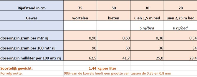 Bij fijnzadige gewassen die ondiep worden gezaaid (tot 2 cm diepte) kan het granulaat ‘gewoon’ in de zaaikouter worden toegepast. Er is dan geen aparte ‘verdeler’ nodig om de korrels goed verdeeld te krijgen.