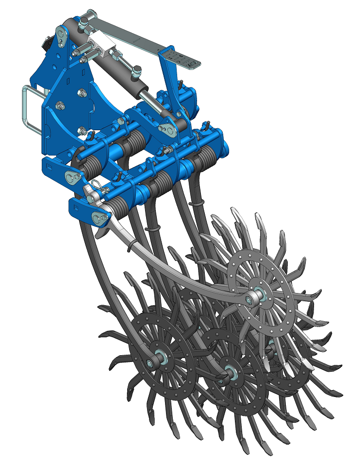Een gepatenteerd systeem zorgt voor een gelijkmatige druk en werkdiepte van de sterwielen tot een verschil in hoogte van 15cm. Hierdoor is er ook in eventueel aanwezige rijsporen een gelijkmatige bewerking mogelijk. De sterwielen zijn gegroepeerd per 6 en opgehangen door middel van een parallellogram. De druk op de wielen kan vanuit de cabine worden afgelezen en is hydraulisch ingesteld tussen de 18 en 29 kg waardoor de bewerking precies aan de bodem en het gewas kan worden aangepast.