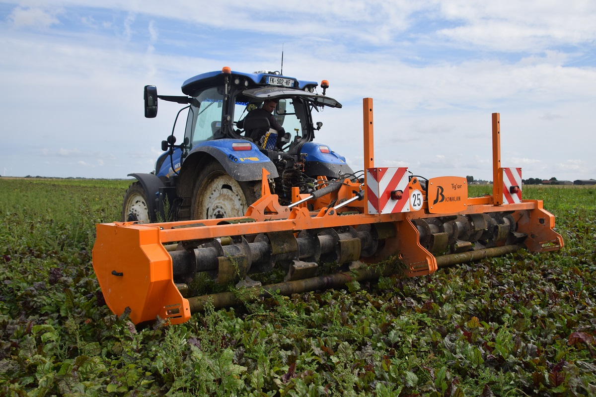 Na een ontwikkelingsproces van meer dan vier jaar, toont de Noord-Franse fabrikant Bionalan een zes meter versie van de Tig’air-onkruidtrekker. De naam komt van het Franse ‘tige’ (stengel) en ‘air’ (in de lucht trekken). Benelux-importeur Martin Heerema (Agri Bio-Solutions) was zo vriendelijk ons uit te nodigen bij een demonstratie in Noord-Frankrijk. “Dit is het eerste prototype, er is er maar één van, maar deze winter gaan ze bouwen want er zijn er ondertussen wel al zeven verkocht. Er is ook nog één exemplaar van drie meter.”