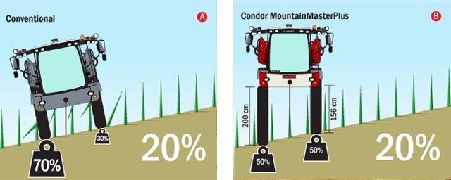 De Condor MountainMasterPlus is uitgerust met een StabiloPlus onderstel dat vergelijkbaar is met de Condor ClearancePlus waarbij de bodemvrijheid vanuit de cabine traploos ingesteld kan worden tussen de 140 en 200 cm. Bij de Condor MountainMasterPlus kunnen de cilinders apart aangestuurd worden waardoor de MountainMasterPlus zich vlak kan stellen op hellingen tot maximaal 20%.