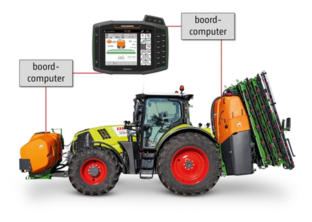 De bedieningsterminal regelt het vloeistofcircuit. Pas wanneer het niveau van de gedragen spuit de 30% -grens bereikt, wordt spuitvloeistof uit de voorste tank naar achteren gepompt.
