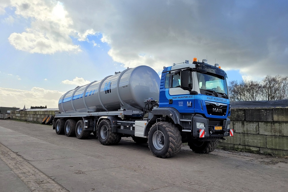 Afnemer Munsters licht zijn ambities met de nieuwe trailer toe: “Deze oplegger zal worden ingezet voor het korte-afstand-werk voor de aanvoer van zelfrijders. Voorheen deden we dit werk met een 3-asser combinatie en nu dus met deze Agro Tanktrailer en de Agrotruck. Het grote voordeel ten opzichte van een normale trekker-oplegger-combinatie is, dat wij er overal mee kunnen komen. We kunnen hiermee op het perceel lossen, op onverharde (zand)wegen rijden en ook op de openbare weg.”