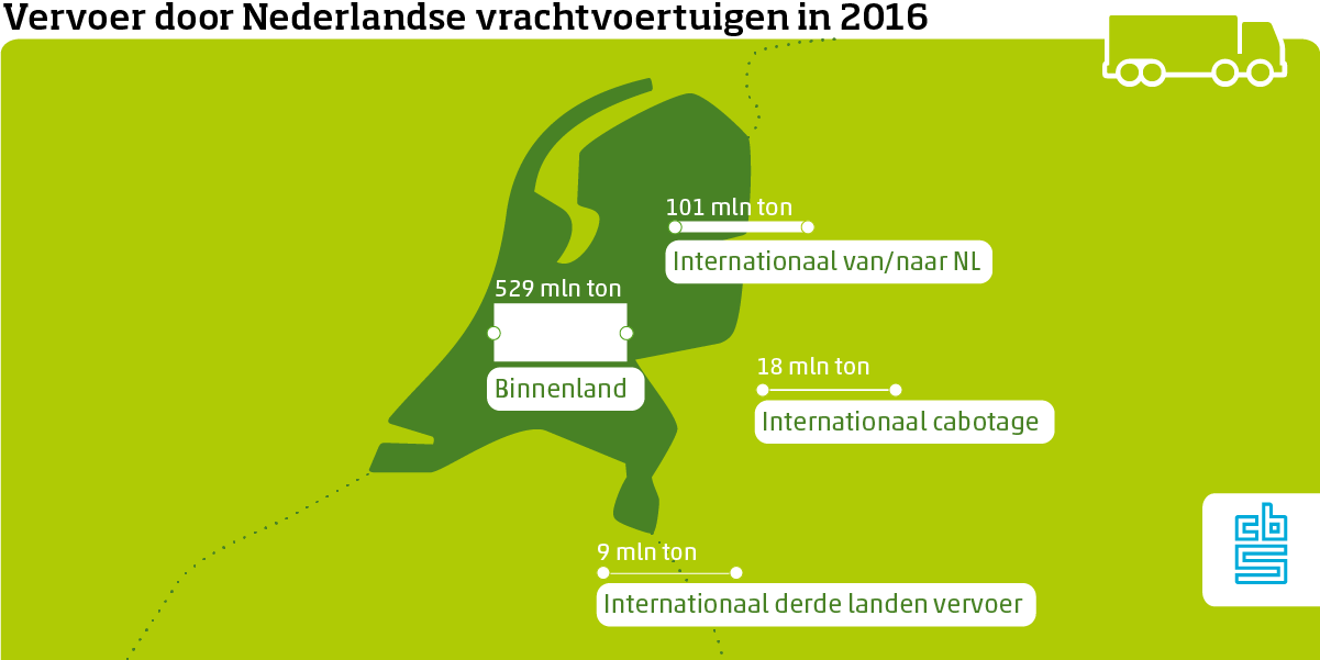 Deze stijging in goederenvervoer over de weg is toe te schrijven aan binnenlands vervoer. Bij deze ritten, waarbij goederen zowel in Nederland worden geladen als gelost, groeide het vervoerd gewicht met 4 procent tot 529 miljoen ton. Het internationale vervoer van en naar Nederland door Nederlandse vrachtauto’s daalde in 2016 licht.