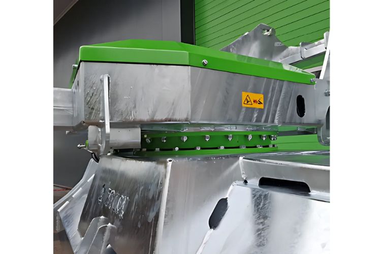 Door middel van een zware draaikrans is de veegmachine hydraulisch schuin versteld. Voor een stabiele werking is de machine voorzien van volrubber wielen (460×105) en een verstelbaar derde wiel. Breedteborden met verlichting completeren het geheel.