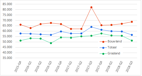 Figuur 1     Prijs (euro/ha) onverpacht gras- en bouwland en totaal (gras-, bouw- én maïsland samen), 2015Q4 -2018Q3 (per kwartaal)