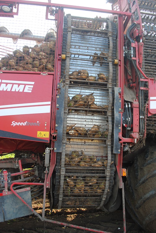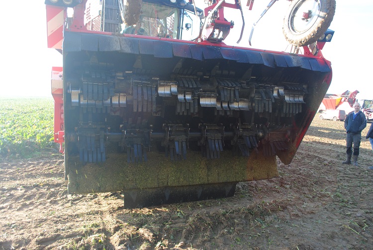Eén van de aanpassingen aan de vernieuwde uitvoering van de bietenrooier is de ringelevator. “Door langzamer te draaien kun je dertig procent meer verwerken”, verklaart verkoopadviseur Otto Strijk van Grimme Nederland. Jac Driessen vult hem aan. “Het concept gaat uit van een soort bouwwijze tassen die voor meer doorvoercapaciteit en productvriendelijk transport naar de bunker zorgen.” Een roterende as voorkomt loof- en grondopbouw tegen de elevator.