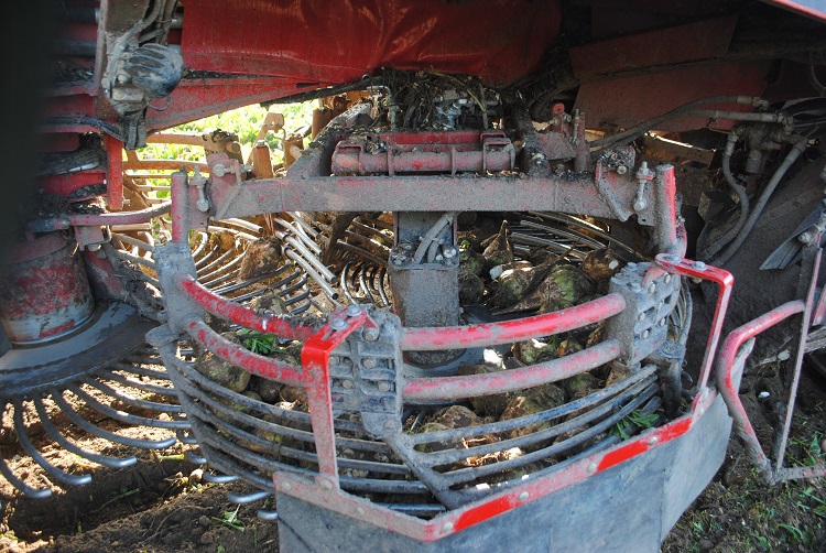 Terug naar de onderzijde van de Rexor is de bietenrooier uitgevoerd met drie reinigingszonnen met traploze snelheidsverstelling. “De positie van de zonnen is iets gewijzigd. Als de rooier links- of rechtsom knikt, houdt die dezelfde doorgang onder alle rooiomstandigheden”, stipt Driessen aan. Door innovatief management kunnen de geleideroosters tot tachtig procent sneller worden verwisseld naar geveerde tanden.