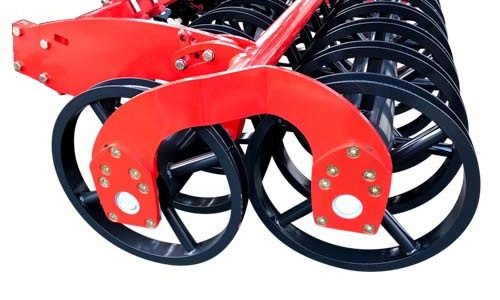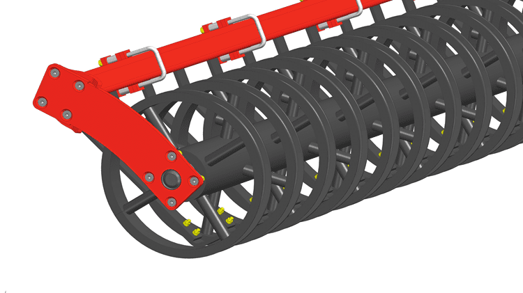 - Actipress-rol: Een enkele U-rol met vier armen per ring, ontworpen om het zware gewicht van de Qualidisc 21000 T te dragen en tegelijkertijd een uitstekend contact met de bodem en een goede structuur te behouden. Wanneer ze gevuld zijn, kunnen ze een gewicht bereiken van 170 kg/m.