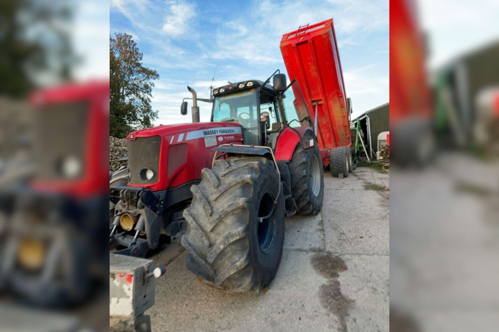 “De MF7499 is vaak actief met het sleepslangen. Op de foto heeft de trekker andere wielen, maar tijdens het bemesten worden er brede banden met zwarte velgen gebruikt. Dan heb je helemaal een mooi plaatje. In dit geval waren we met twintigtonner aardappelen aan het rijden. De aardappelen werden gestort op het erf van een klant.”