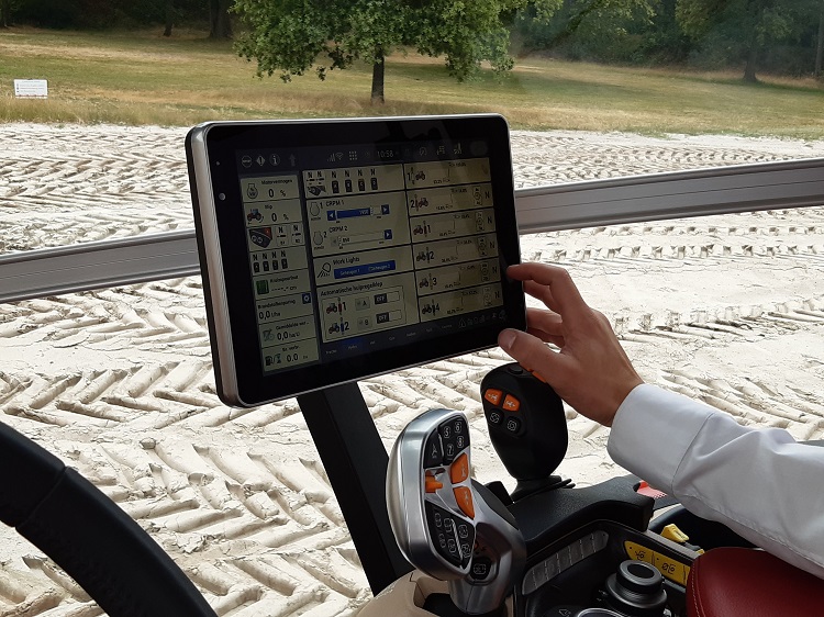 Tijdens de testrit kregen we het gezelschap van Ewoud Raeman, Field Product Specialist, zeg maar specialist wat betreft bediening. Hij toonde een aantal features op de bedieningsterminal. “Je kan sleutels gaan toevoegen om op die manier met dezelfde sleutel te kunnen werken op meerdere trekkers. Klanten vragen hiernaar omdat ze soms een korting kunnen krijgen op hun verzekering door de startonderbreking. Ook het portaal wordt steeds belangrijker, bijvoorbeeld om instellingen uit andere trekkers over te nemen.” Een interessante feature die Raeman toonde, is de Ride Control. Hierbij gaat de trekker het gewicht van de machine in de hef gebruiken om extra soepel te rijden. “Als de vooras in een put rijdt, weet de trekker wanneer hij aan de achteras is en gaat dan het gewicht naar beneden sturen om te zorgen dat dit minder invloed heeft. Hij gaat ook de cabine zachter zetten op dat moment. Dit systeem werkt onder meer via versnellingssensoren aan de vooras en in de cabinevloer.”