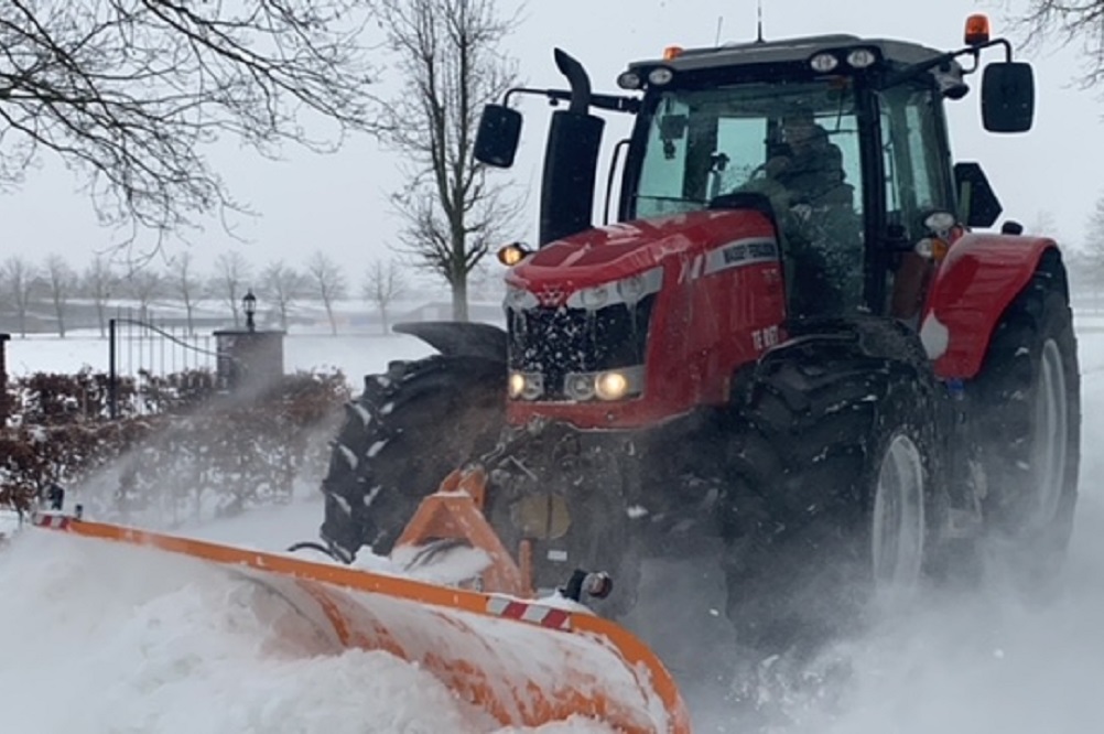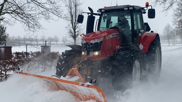 Ook loonbedrijf te Riet uit Haaksbergen (OV) is druk met de sneeuw. Met een Massey Ferguson 7615 wordt de weg vrijgemaakt.