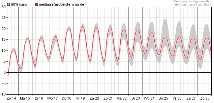 Grafiek 1: De weerpluim geeft met Pasen warm weer aan. Echter volgende week wordt de wisselvalligheid wel wat groter. (Bron: WeerPlaza)