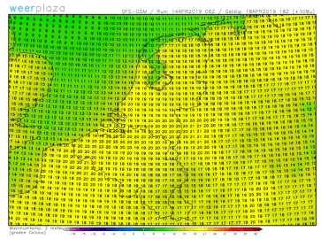 Afbeelding 2: Donderdag wordt waarschijnlijk een warme dag met temperaturen >20 graden. (Bron: WeerPlaza)