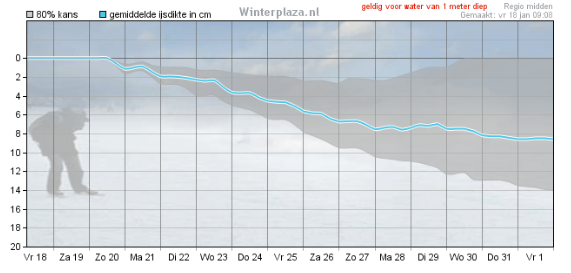 Volgens de meest recente ijsgroeipluim is de ijsdikte op stilstaand water van 1 meter diep ongeveer halverwege de week 3 centimeter, in het weekend 6 tot 8. Van grote toertochten is voorlopig dus geen sprake, maar wanneer de verwachting uitkomt zullen toch enkele waaghalzen bij deze ijsdikte op het ijs stappen. Omdat de waterdiepte op ondergespoten banen zeer klein is, kan ijs daar snel vormen. Er is dus een kans dat, op basis van de huidige berekeningen, donderdag al op een enkele sintelbaan kan worden geschaatst. Blijft het koud, dan is de kans in het weekend groter.