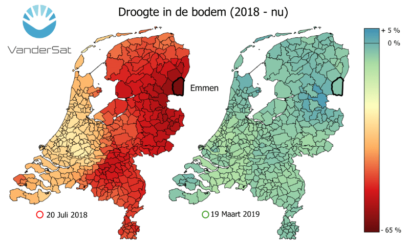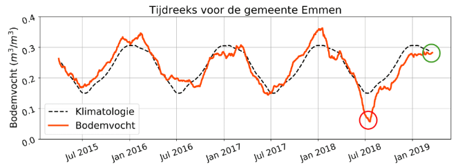 Door recente technische ontwikkelingen is het nu mogelijk om met geavanceerde satellieten van NASA en ESA deze vocht condities in kaart te brengen. In het onderliggende figuur (1) hebben we deze technologie toegepast en de sterkte van de droogte bepaald voor elke gemeente in Nederland. Dit hebben we gedaan aan de hand van een meerjarige dataset die verkregen is uit satelliet observaties. De gemeente Emmen in het oosten van Nederland laat de grootste uitslag zien op gemiddeld de droogste dag. Eind mei 2018 dook het bodemvocht onder het normale niveau en bleef daar bijna 10 maanden onder. De regen van de afgelopen weken hebben eraan bijgedragen dat we nu langzaam weer op een normaal niveau zitten, zie grafiek 1.