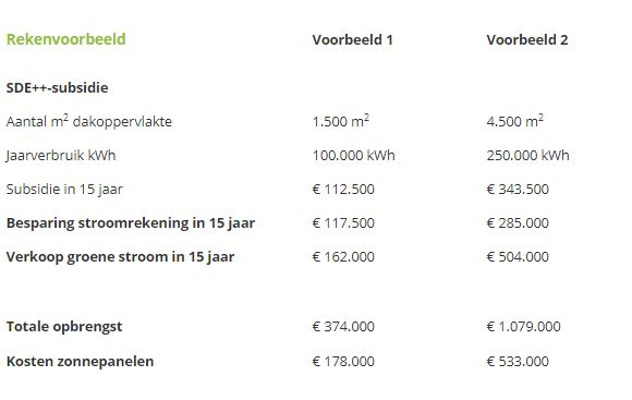 Stel een ondernemer heeft 1.000 m2 dakoppervlakte en verbruikt jaarlijks 100.000 kWh aan energie. Hij kan in aanmerking komen voor de nieuwe SDE++-subsidie (de vervanger van de SDE+-subsidie), waarmee hij 15 jaar lang subsidie krijgt per opgewekte kWh. Ook bespaart hij flink op zijn energiekosten, omdat hij zijn opgewekte energie gratis kan verbruiken. Alle energie die zijn zonnepanelen opwekken maar die hij niet verbruikt, gaat het net op, waar hij een vergoeding van de netleverancier voor krijgt.