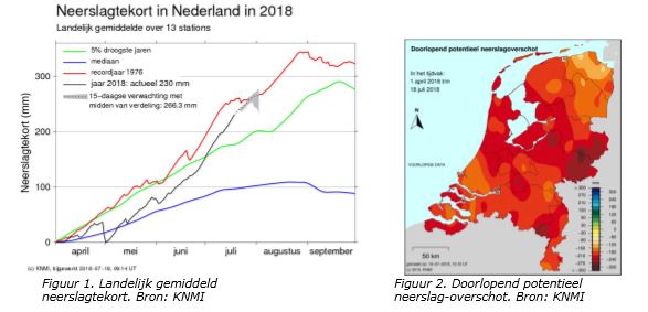 Het neerslagtekort is in heel Nederland de afgelopen week verder toegenomen. De verwachting is dat het neerslagtekort in de komende periode zal stijgen naar 266 mm. Een dergelijk neerslagtekort is vergelijkbaar met de situatie in het recordjaar 1976. Code geel, dreigend watertekort, is van kracht. De Landelijke Coördinatiecommissie Waterverdeling komt wekelijks bijeen en volgt de situatie op de voet.