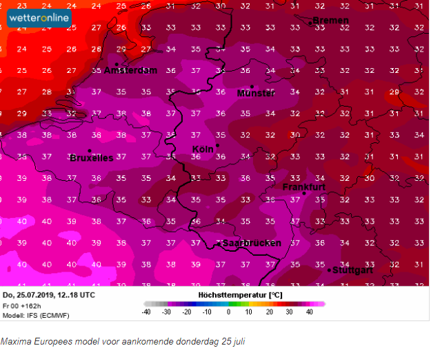Donderdag heeft het er ook nog alle schijn van dat het in het grootste deel van het land tropisch wordt met maxima tussen 30 en 35 graden. In het zuiden is het niet uitgesloten dat het nog warmer wordt. Zowel het Europees model als het Amerikaans model laten donderdagmiddag langs de zuidgrens temperaturen zien tussen 36 en 38 graden. (Lokaal nog hoger, maar dat durf ik niet eens op te schrijven). Deze extreme hitte is een optie, maar nog wel ver weg. De komende dagen moet duidelijker gaan worden of we echt deze kant op gaan. Gaat het gebeuren dan gaan er wel weer warmterecords sneuvelen. Vanaf vrijdag neemt de kans op regen en onweersbuien toe, maar is er ook nog een aanzienlijke kans dat de maxima (ruim) boven 25 graden blijven.