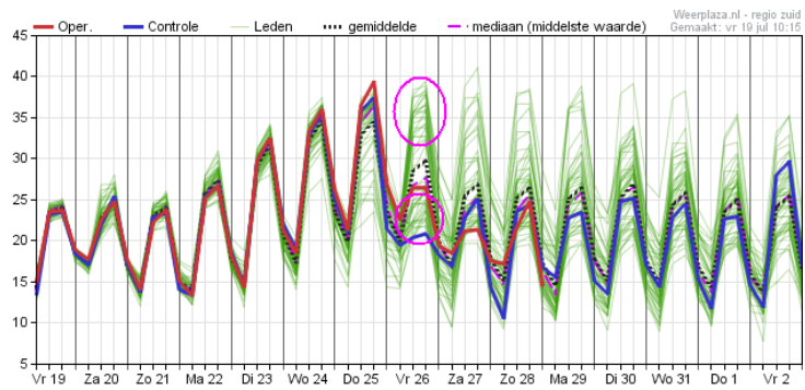 De grafiek laat goed zien dat er vanaf vrijdag een onzekere situatie gaat ontstaan. In de twee paarse cirkels zien we bundeltjes uitkomsten. Een flink aantal uitkomsten zitten nog steeds op de warme koers, maar er is ook duidelijk een bundel tussen de 20-25 graden. Dus we moeten het afwachten.