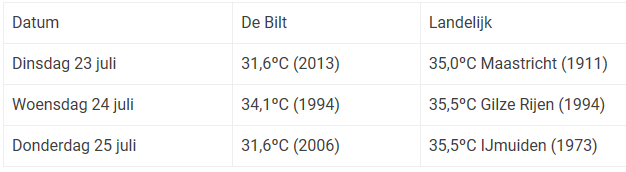 Dinsdag heeft een hogedrukgebied zich genesteld boven Duitsland en Polen en wordt de stroming in Nederland zuidoostelijk. Zeer warme en ook droge lucht kan ons land dan bereiken en de temperatuur schiet omhoog. Onder een brandende zon wordt het 28 graden op de Wadden en 32 graden in Limburg. In het grootste deel van het land wordt het al tropische warm. Woensdag gaan de temperaturen nog verder omhoog en kan het regionaal (ruim) 35 graden worden. De wind is overwegend zwak en brengt niet direct verkoeling. De stranden zullen deze dagen vollopen, daar kan een duik in de Noordzee nog voor afkoeling zorgen en dinsdag steekt er mogelijk ook nog een bries van zee op.